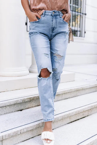 Light Blue Distressed Holes Straight Jeans
