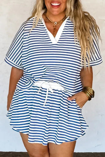 "WAITLIST" Blue Stripe Short Sleeve Collared V Neck Top Plus Size Skort Set