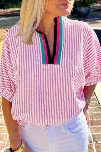 "WAITLIST" Sachet Pink Striped Print Contrast Split Neck Dolman Sleeve Blouse
