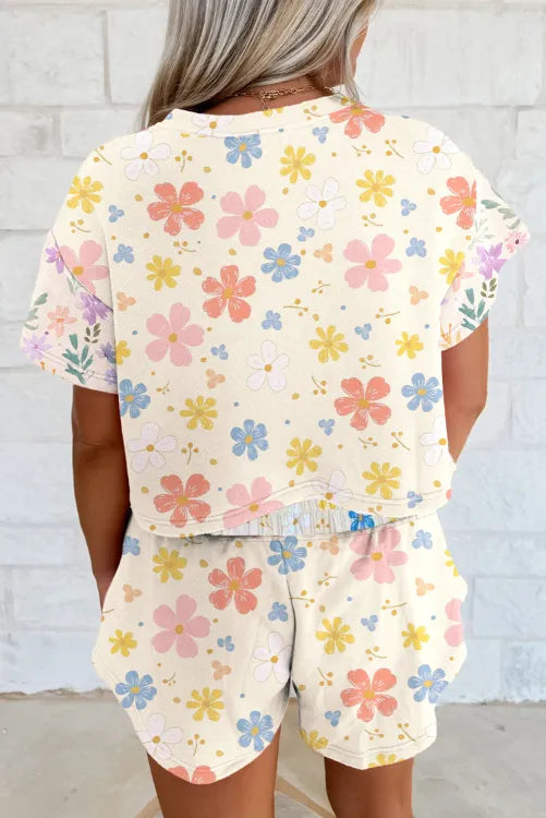 Apricot Floral Print Crop Top Wide Leg Short Set